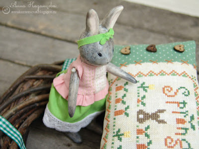 Фотографии пришлось уже делать на бегу, поэтому их крайне мало. Не помню, рассказывала ли я, что на день рождения решила побаловать себя и заказала у талантливого мастера Анны вот такую заюшку. По приезду домой она назвалась Зоя. Ну так и живём :) Именно она немой свидетель моих рукодельных "подвигов".